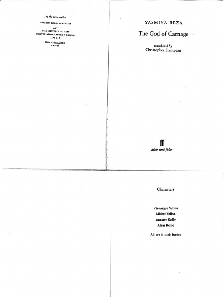 As in life x 3 the dramatist has assembled four people in a room, two couples veronique and michel vallon paired against alain and annette reille. I was lucky enough to catch the original west end production of the god of carnage in 2008. It contains very strong language. Theatre royal bath touring until february 15, 1hr 30mins. Can two sets of rational and polite adults solve their children's quarrels in a calm and civilized manner? Script for god of carnage by yasmina reza. 75%(24)75% found this document useful (24 votes). Wake forest university, anthony aston players, 2012. Yasmina reza, translated by christopher hampton. At one point cameron mackintosh, the theatre owner, appeared to explain: Yasmina reza, born in paris in 1959, is an acclaimed playwright, screenwriter, and novelist. God of carnage), reza focused on two couples who meet to discuss a fight between their young sons. While trying to come to an agreement on how to best fix the problem, they become childish and behave like their children.